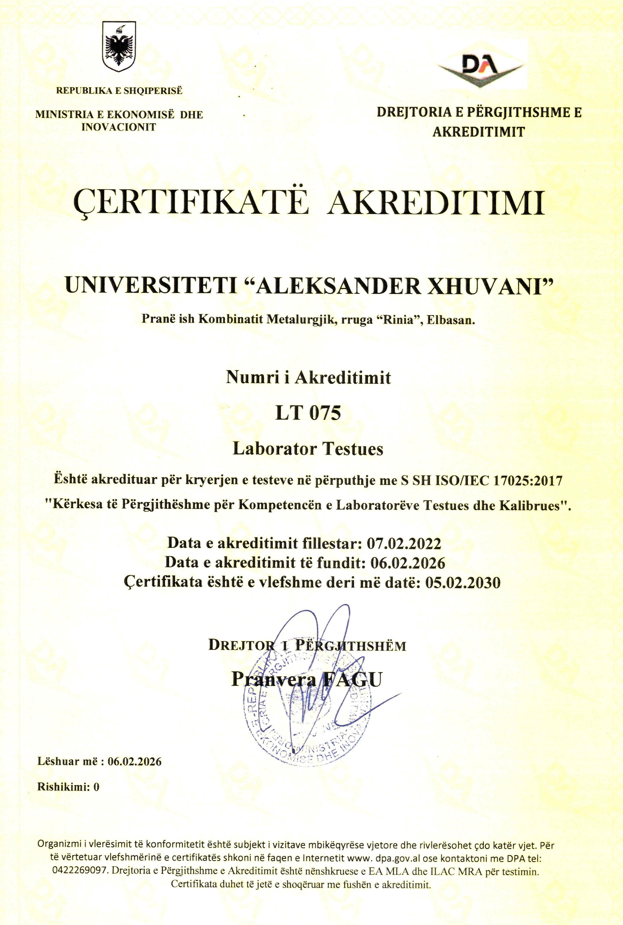 Certifikata e re e Akreditimit të Laboratorit Kërkimor Shkencor, e cila është e vlefshme për katër (4) vitet e ardhshme (06.02.2026 -05.02.2030). Ky riakreditim përfaqëson një arritje të rëndësishme për laboratorin dhe për Fakultetin e Shkencave të Natyrës, pasi përveç rinovimit të akreditimit ekzistues, janë shtuar edhe dy metoda të reja testimi, konkretisht: