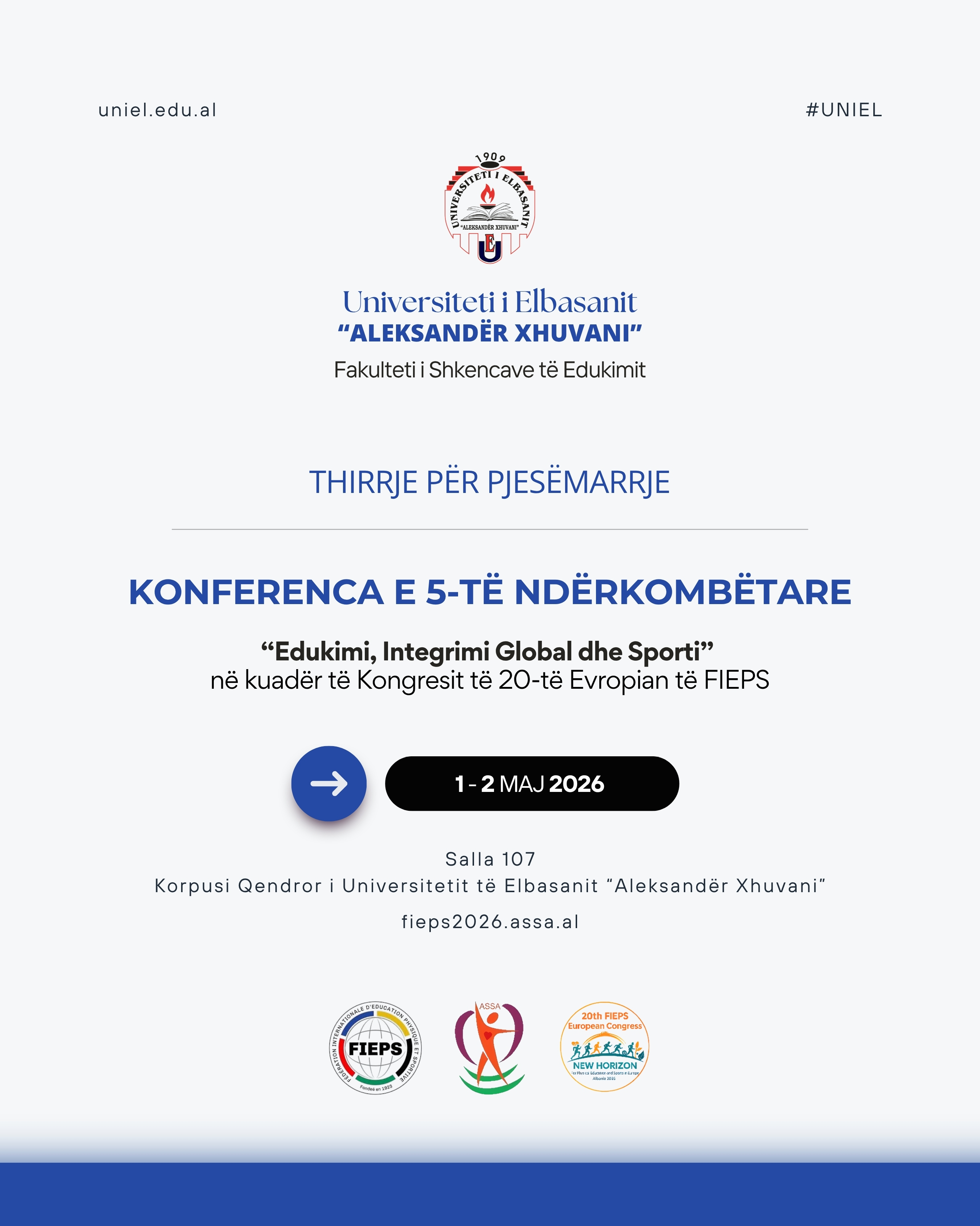Fakulteti i Shkencave të Edukimit në Universitetin e Elbasanit “Aleksandër Xhuvani” shpall thirrjen për pjesëmarrje dhe bashkëpunim në Konferencën e 5-të Ndërkombëtare për Edukimin, Integrimin global dhe Sportin, në kuadër të Kongresit të 20-të Evropian të FIEPS, e cila do të mbahet në 1-2 maj 2026 në Elbasan.