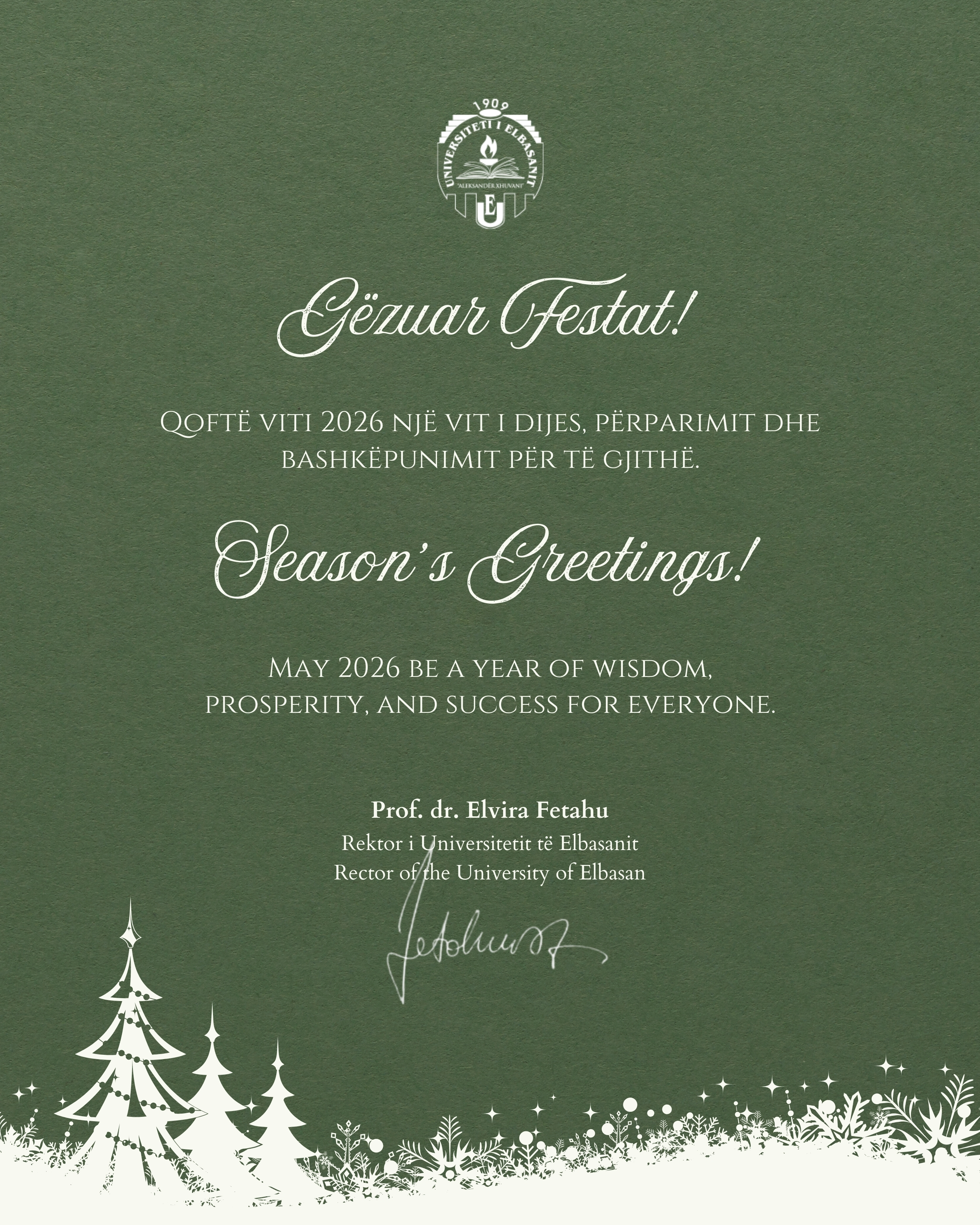 Të dashur studentë, personel akademik dhe ndihmësakademik, kolegë dhe miq të Universitetit të Elbasanit “Aleksandër Xhuvani”, ju urojmë festa të gëzuara dhe një Vit të Ri 2026 plot shëndet, paqe dhe suksese!